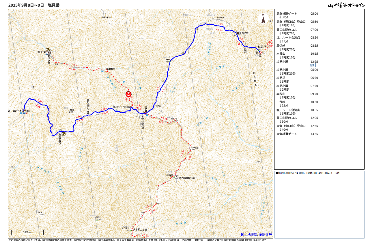 去年行った塩見岳のルートは、ガイドブックがベースですが、2泊3日→1泊2日に短縮しています。実際には1日目の到着が30分くらい早かったので、2日目の登頂を初日に切り替えましたが。